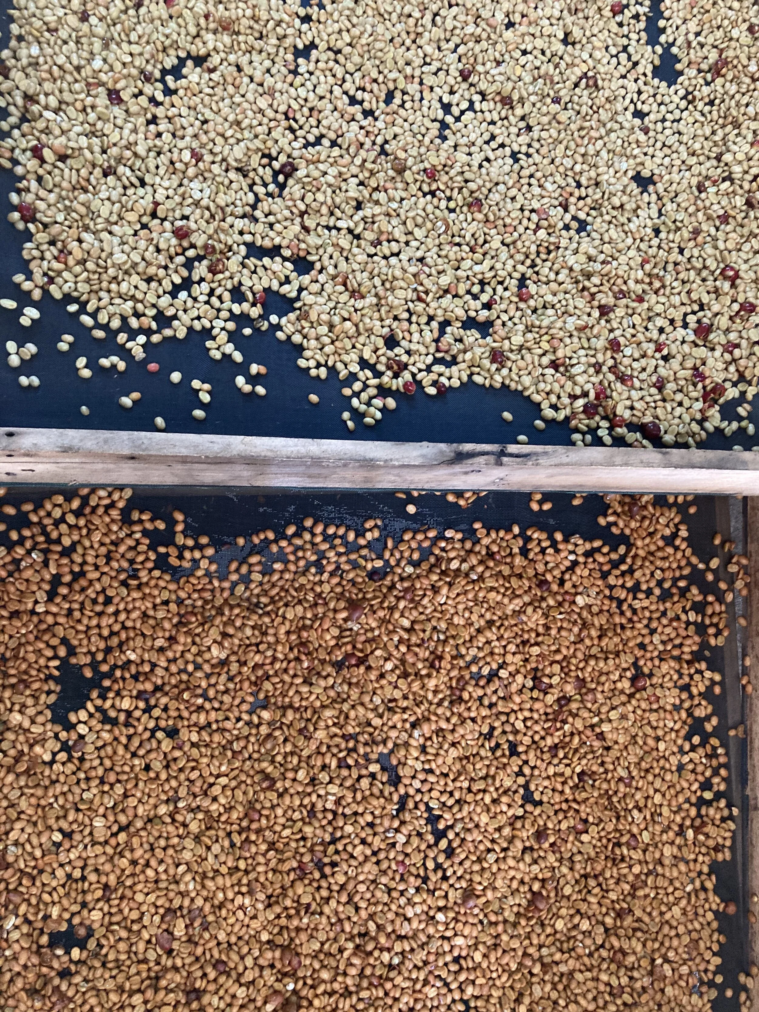 Honey Amarillo. Despulpado, fermentación con las mieles dejando secar a sol directo, y luego en sombra, en camas africanas.